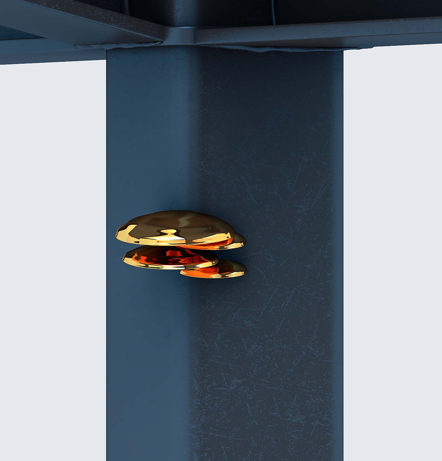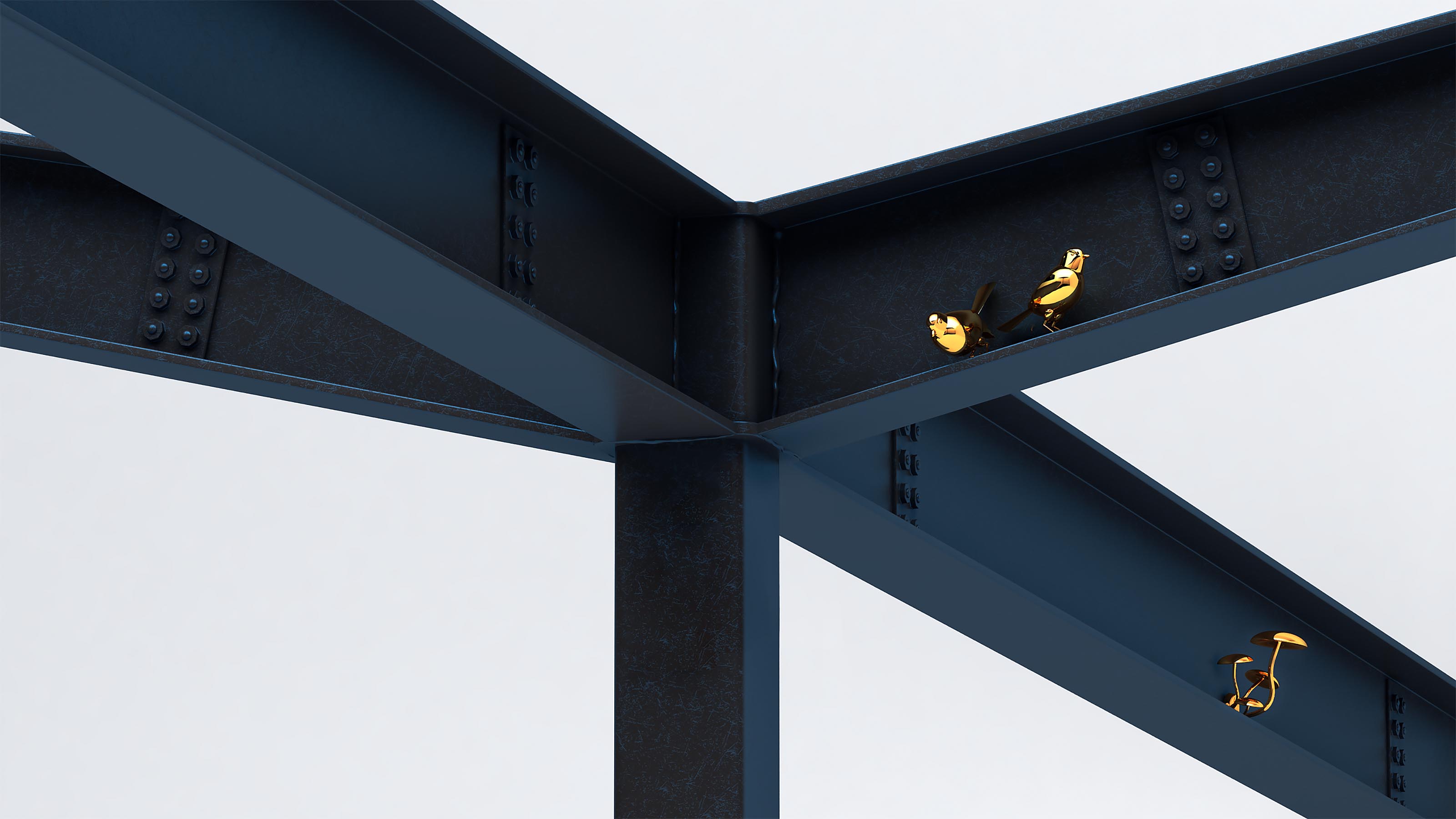 The steel structures of the station are like sturdy trunks of trees against an ink blue winter night. These majestic branches create a stunning silhouette. When walking underneath the network of beams, an eagle-eyed traveller may discover precious gems, the inhabitants of the forest. Little golden statues of birds, flowers, fungus and other flora and fauna are sitting on the beams, looking down upon the swarm of commuters.
