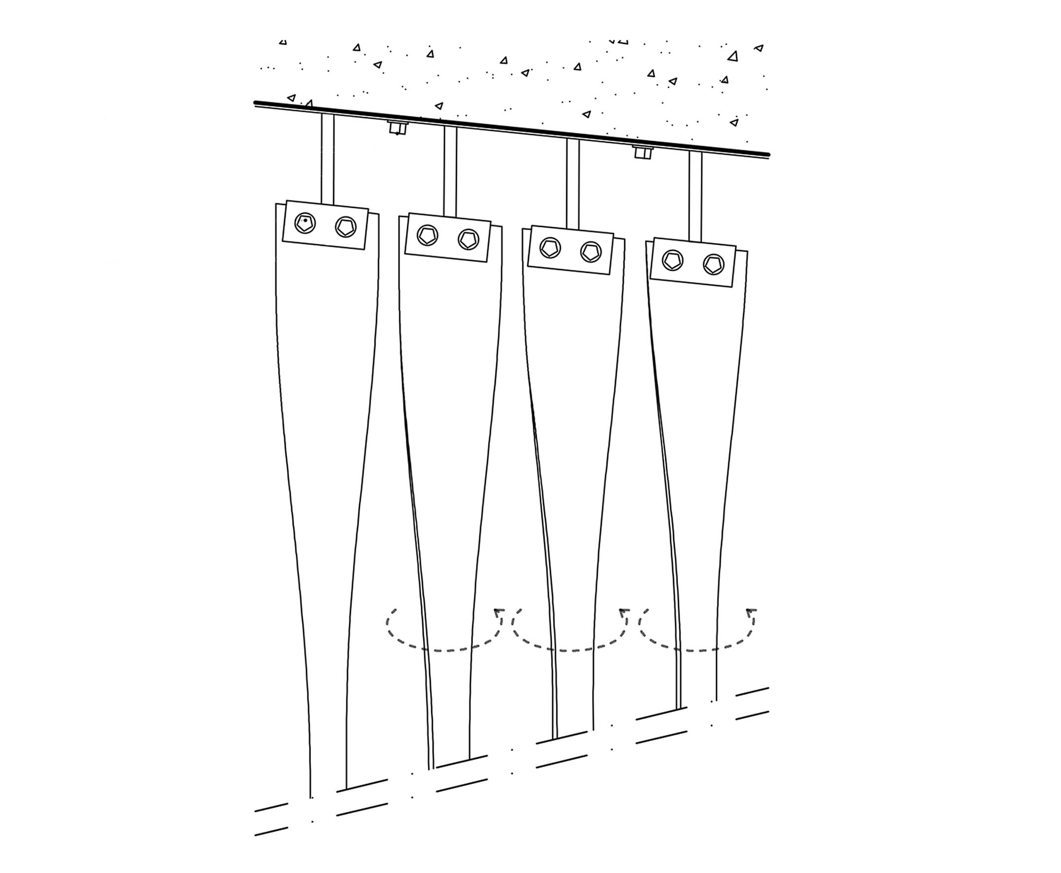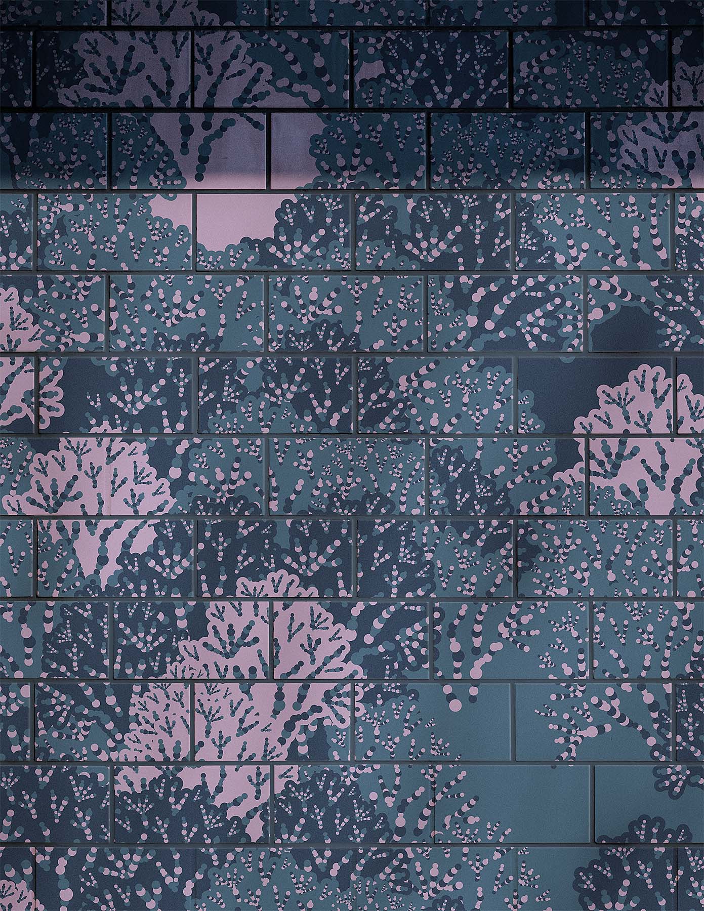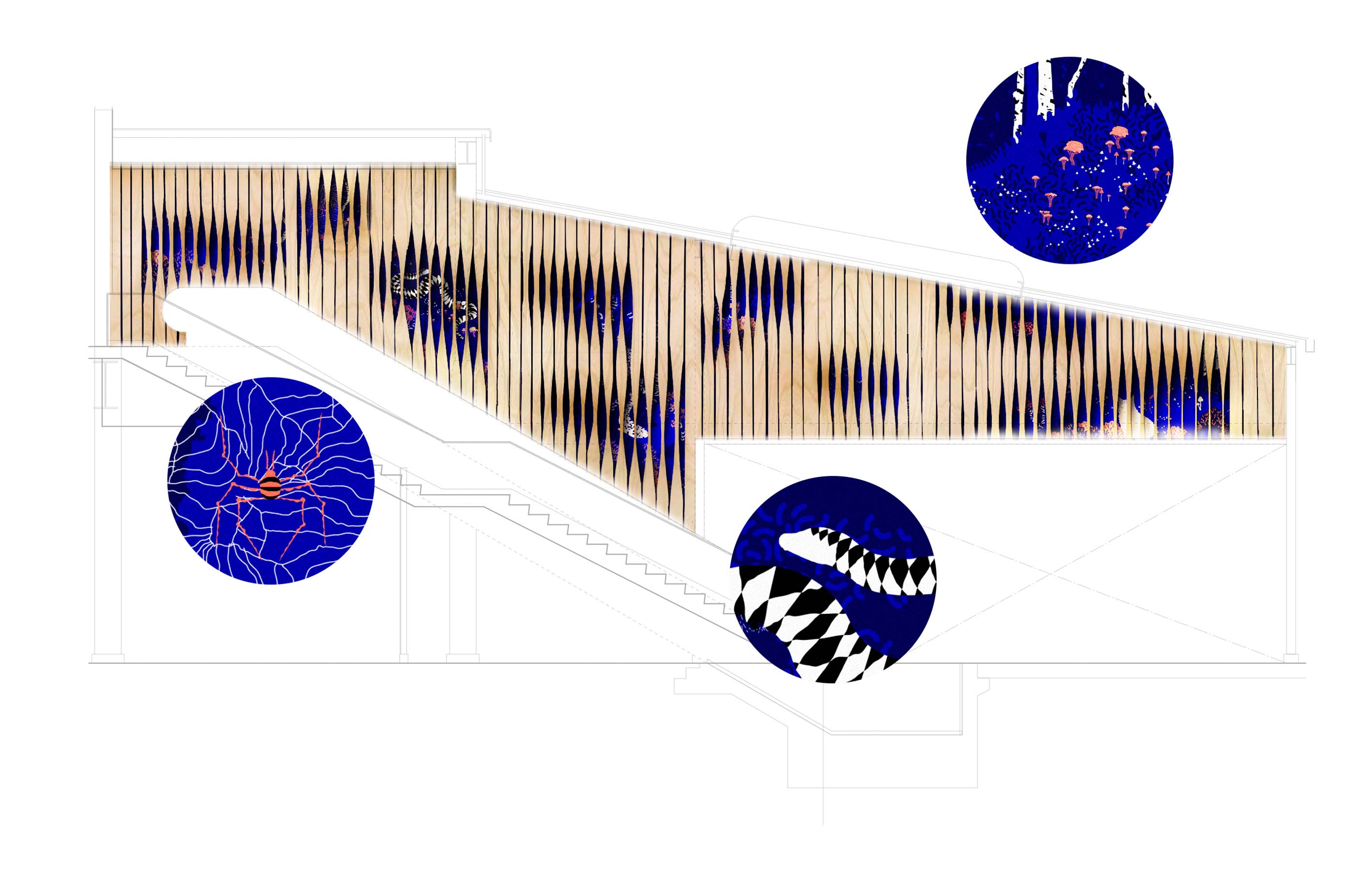 The stairways feature a large forest-themed relief with birch lamellae covering them. You get to see glimpses of fascinating details here and there when the lamellae are twisted in rhythmic forms, revealing what they hide behind them. Some of the details can only be seen when you are descending the stairs, some when you are going up. The seasonal forest illustrations are also made by the Kuudes design team.