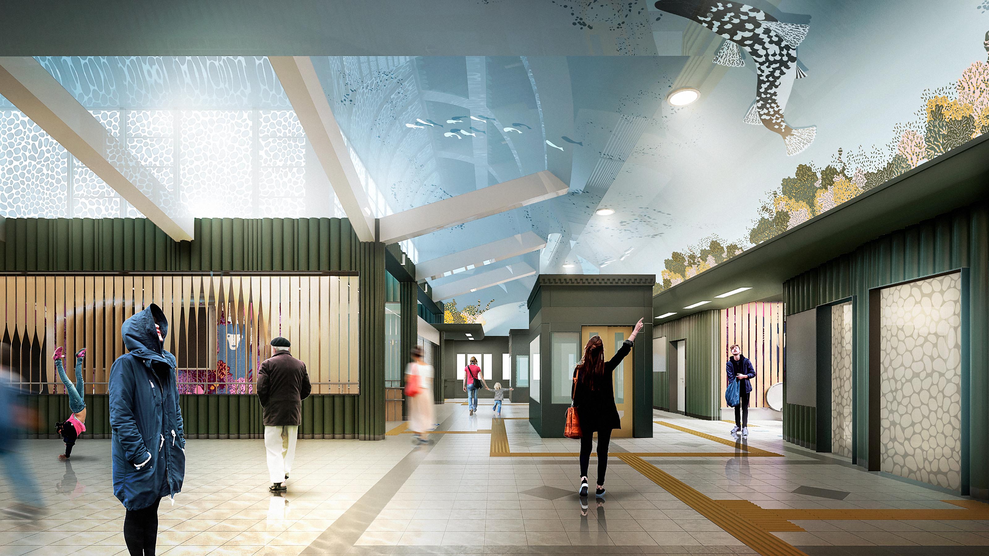 In the second-floor hall, you can imagine yourself standing at the bottom of the lake. Looking up, the ceiling is filled with the bustling life of the underwater community that’s normally hidden under the surface. The schools of fish are swarming elegantly among the underwater greenery and the colourful seaweed.